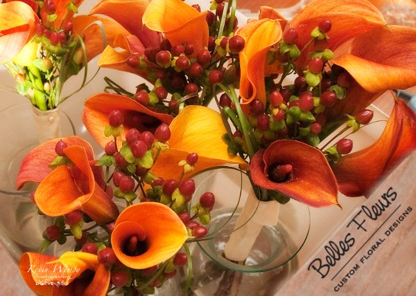 Leah could not have looked more breathe taking on her wedding day in a pure white gown with a stunning cap sleeve lace shrug. She carried a bouquet of miniature ivory calla lilies, white roses, and bear grass to compliment her look and was joined by her bridesmaids who wore chocolate brown gowns and carried mango calla lilies and coffee hypericum berries.